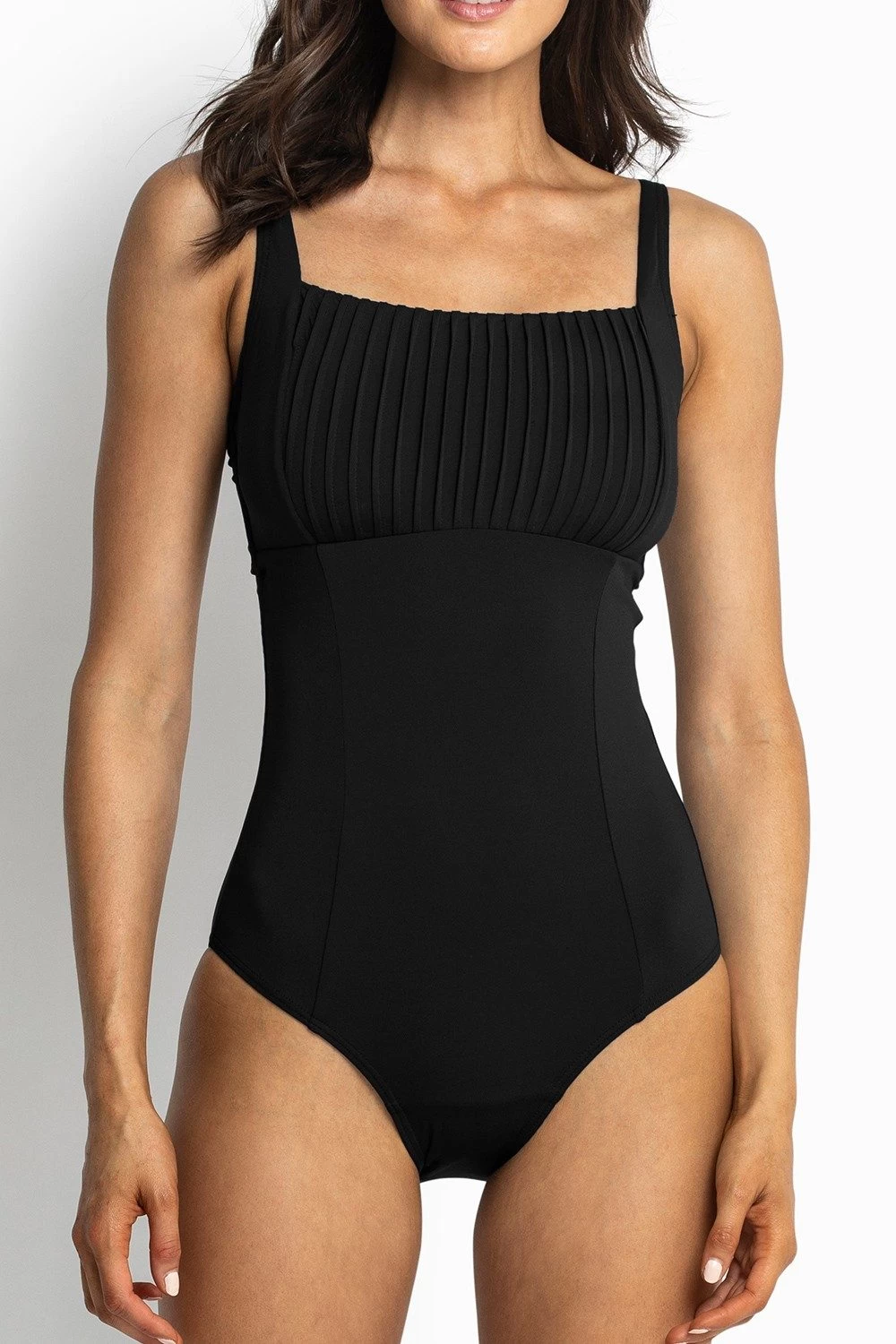 Powermesh fabric has been incorporated in the front of the suit to smooth and flatten the tummy and shape curves.